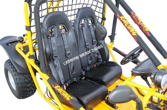 An adjustable seat, electric start and automatic transmission make the 200GKD easy to operate for any size driver, and the rear safety net and 3-point seat belts make this off-road buggy as safe as it is fun!